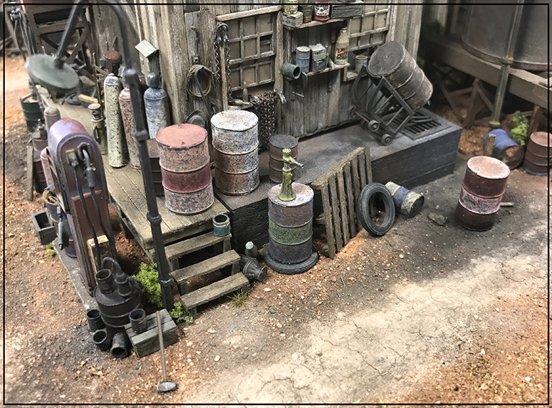 Removing the covered driveway exposes the raised concrete slab and sump underneath. The wonderful oil drum tipping cradle is one of my new laser details. Oil drums were off loaded from trucks using the tires to cushion their landing. They were then clamped onto the cradle and tipped over the sump where the oil would drain and be pumped into the large oil tank. Can't you just smell the oil? I assure you that the oil stain is 100% totally dry in the photograph. I will teach you how to achieve such realism using a water based paint, chalk, and rubbing alcohol. While we are looking at this scene notice the incredibly realistic weathering on the drums. This is so simple to achieve you won't believe it. I can't wait to share these techniques with you. A special thanks to Brian Marriott for his expertise in consulting with me to achieve this highly prototypical scene.